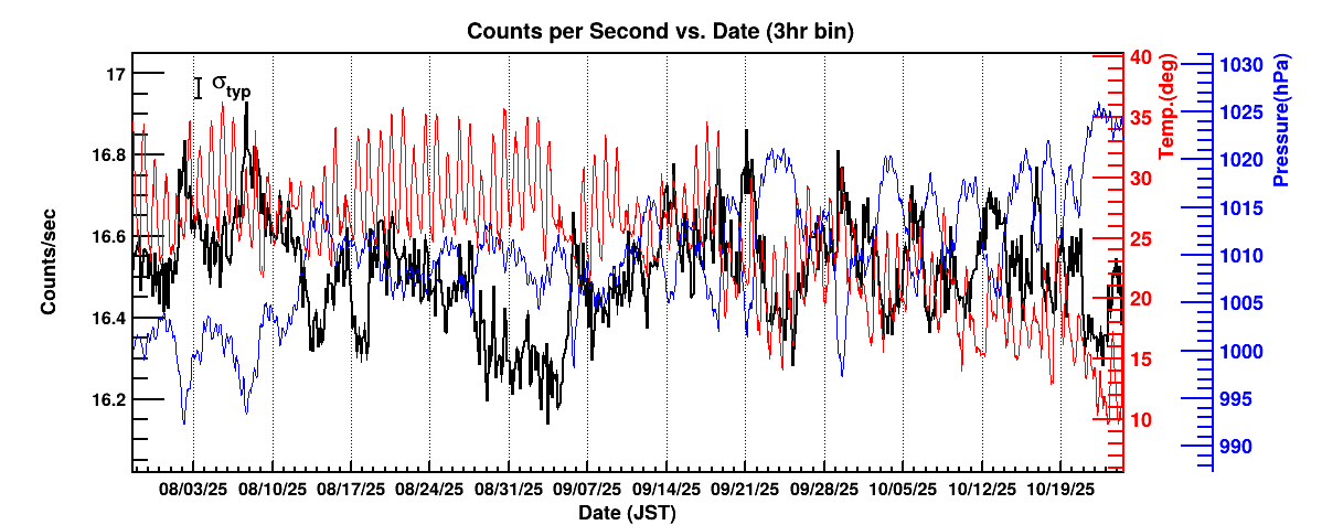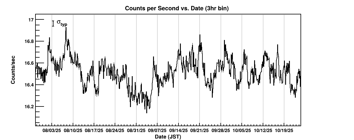 このモニタでは、プラスチックシンチレータ(サイズ:L850mm × W150mm × T6mm)を2枚重ねて配置し、両方を同時に通過した粒子の個数を1秒ごとに計数・記録しています。 この計測を繰り返し継続的に実行することで、ミュー粒子の到来頻度をモニタリングしています。